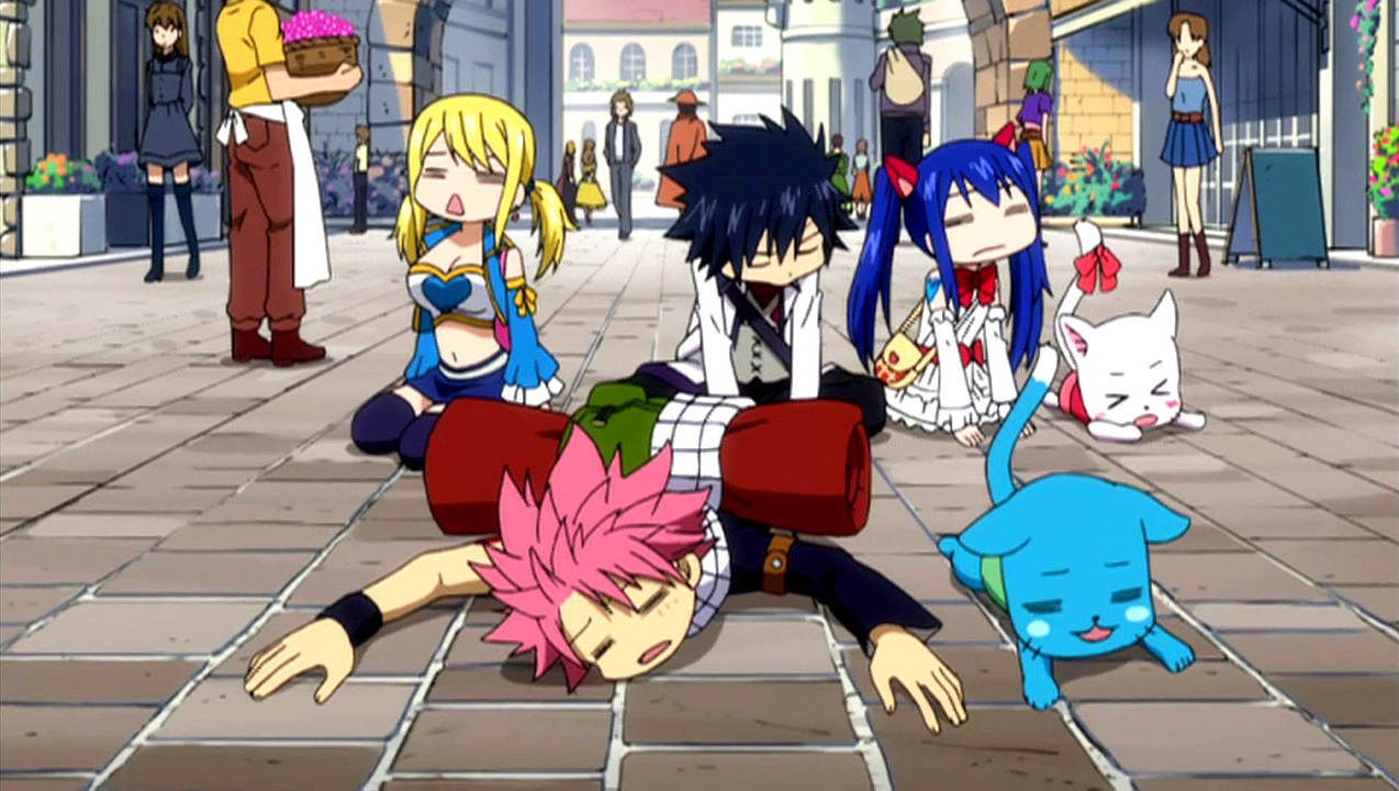 A história de fairy tail gira em torno das aventuras de seus protagonistas, natsu dragneel a maga lucy heartfilia, tendo o gato happy.
